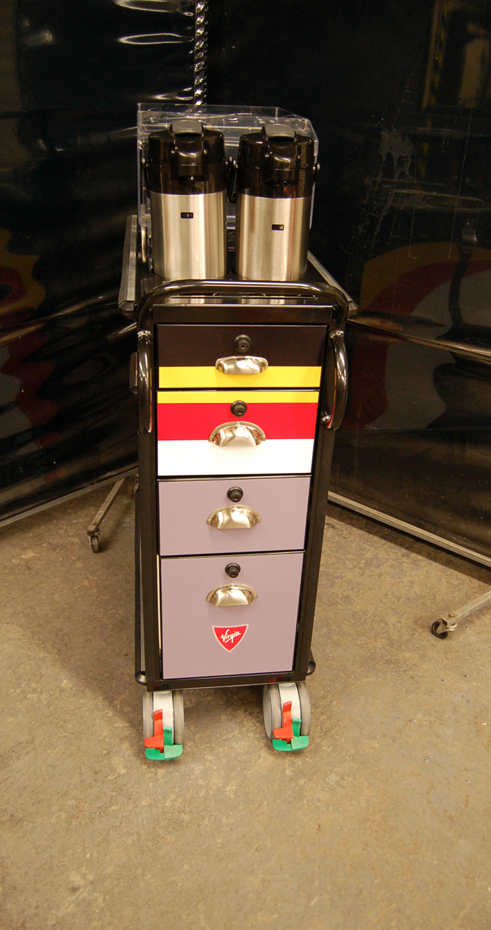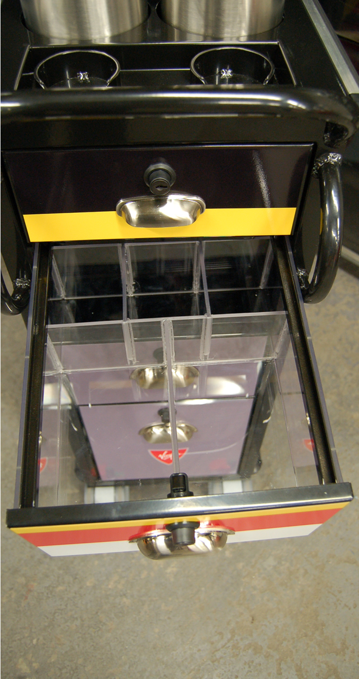 Providing clear drawers and baskets our onboard services trolley allows for complete customer visibility of all products on offer, maximising sales potential. The ideology is that customers don’t admire the shelves in a supermarket, just grab the product and go and therefore by utilising PET G plastic (FDA approved) the baskets have become invisible. The S-Lite onboard services trolley delivers brand identity, with endless colours available.